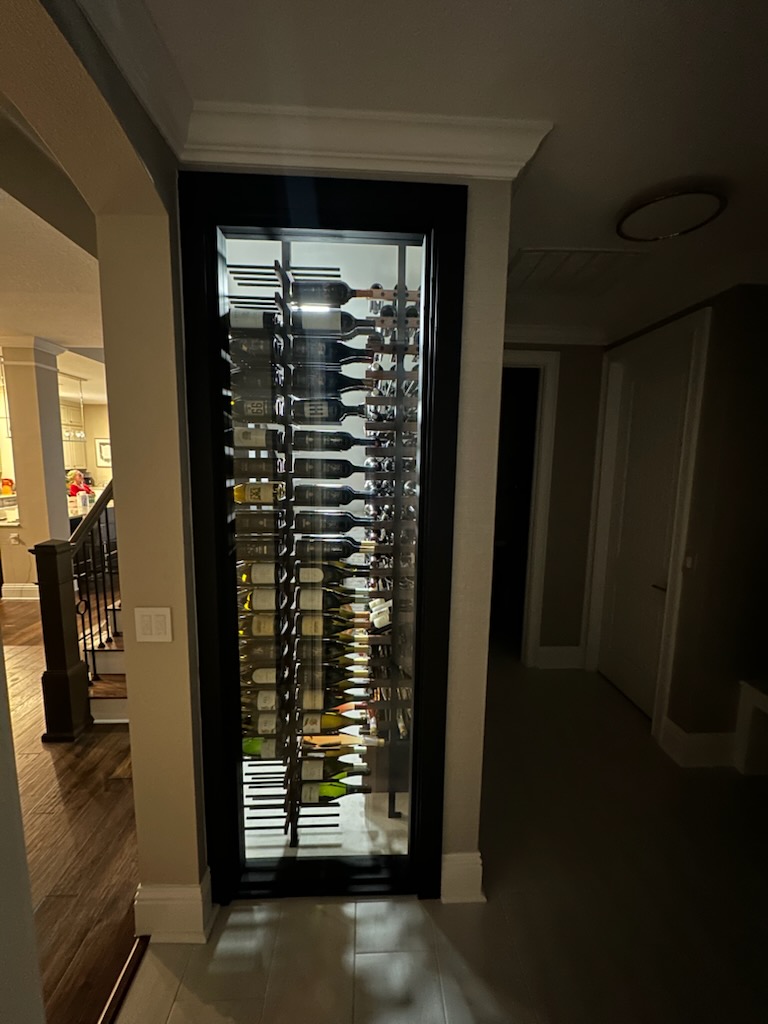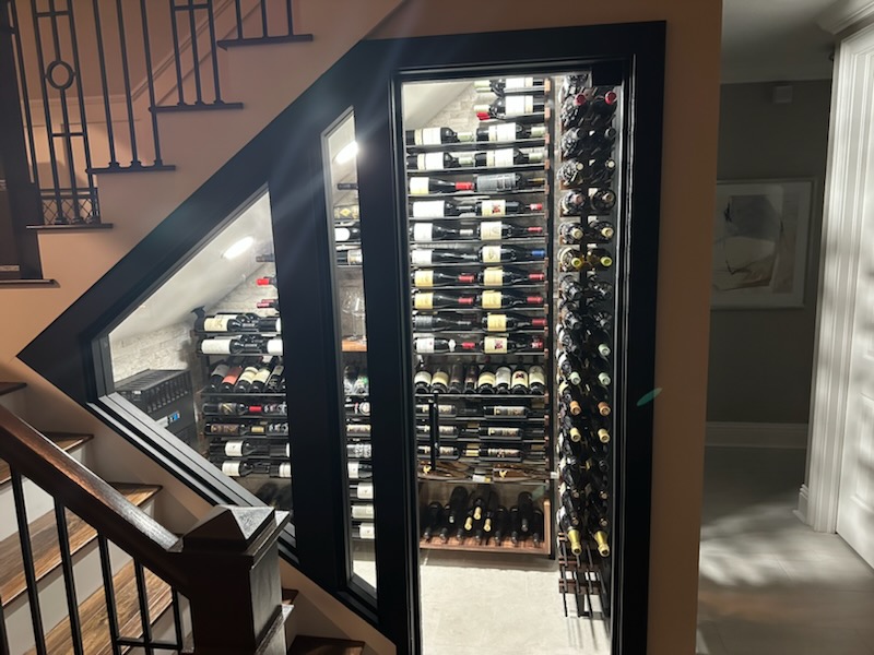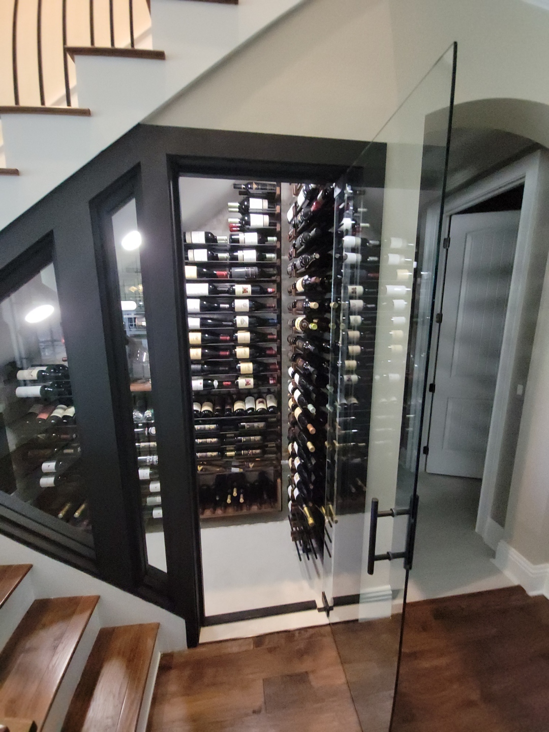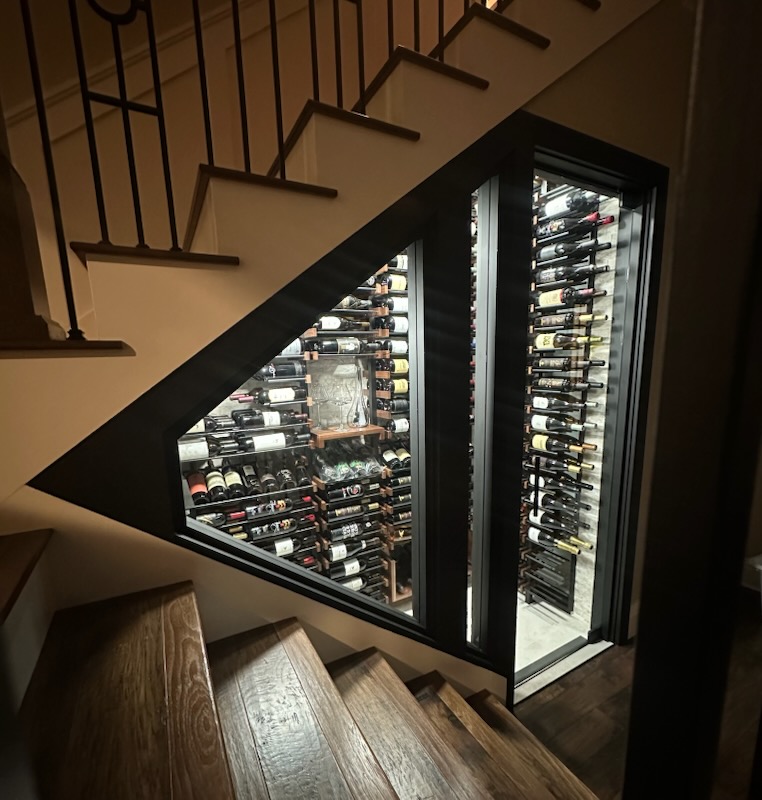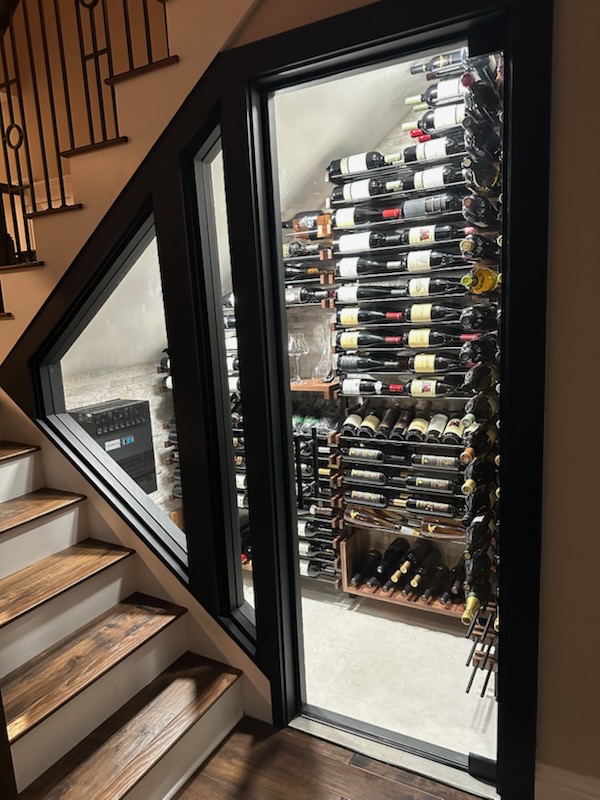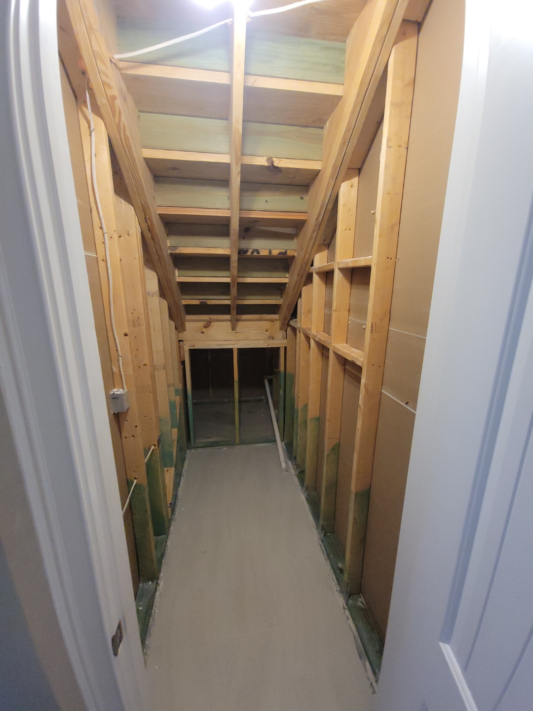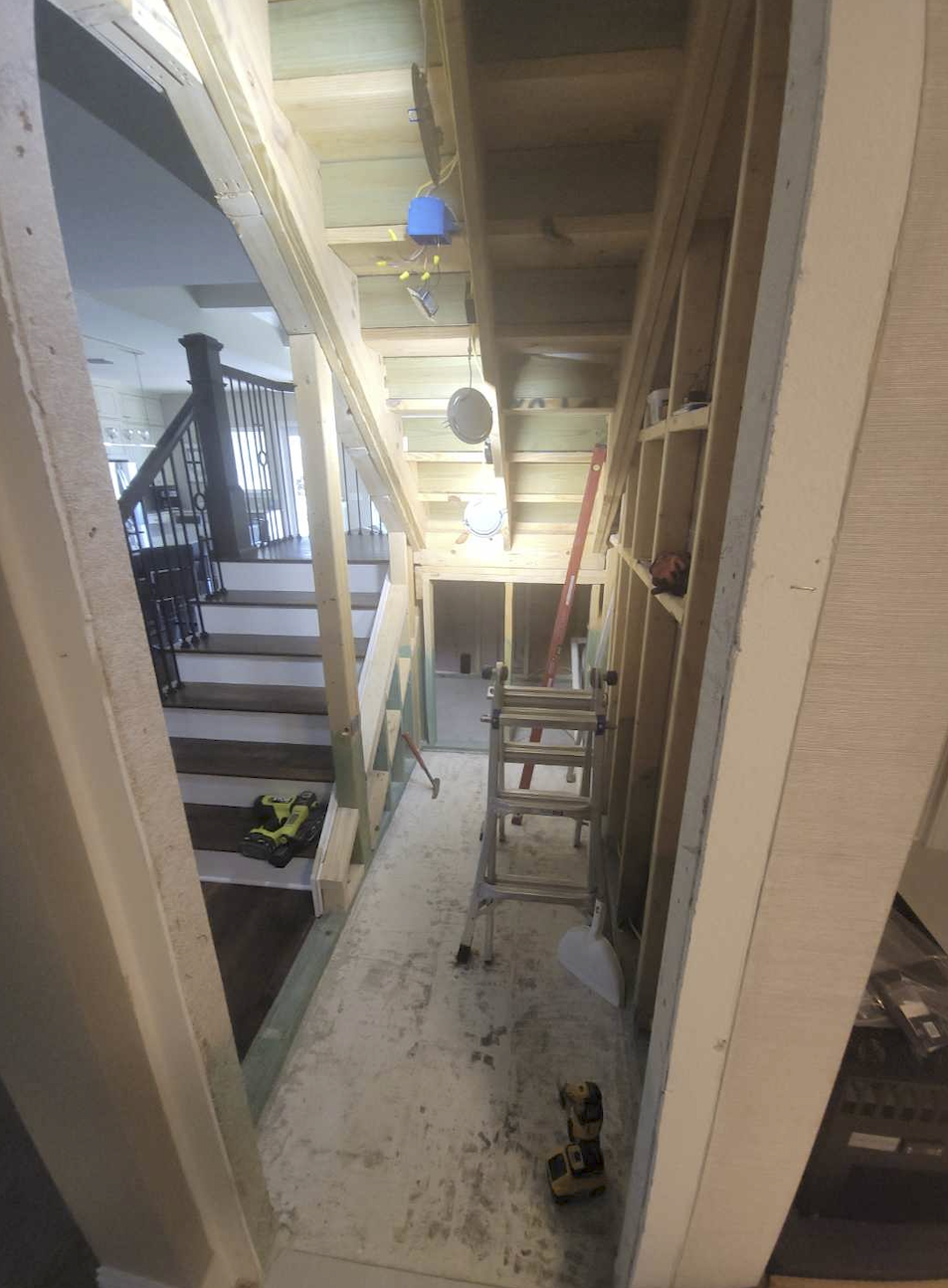 Beneath the staircase was an unfinished, exposed framing cavity — a narrow, angular void defined by raw lumber, visible wiring, and a bare concrete floor. It had no insulation, no finishing materials, and no clear function.